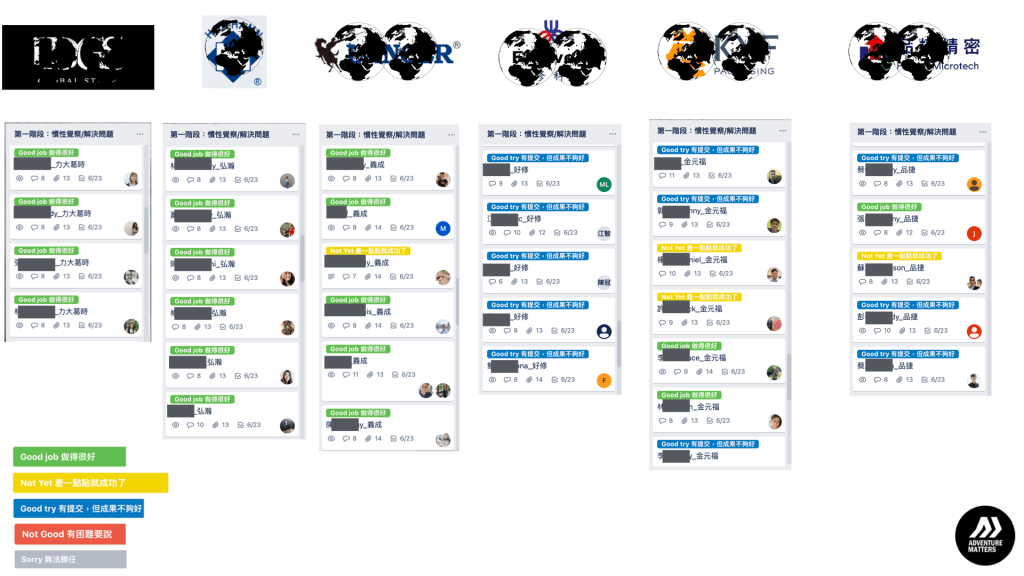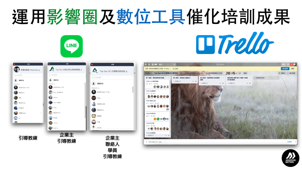 - 企業主或高階主管必須全程參與旁聽,並加入共學 Trello 及 Line 群組,共同監督培訓成果,如企業主或高階主管無法配合,不得加入企業聯合幹訓班方案。
