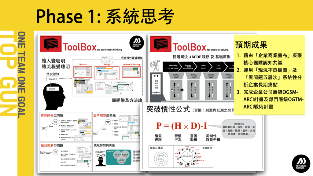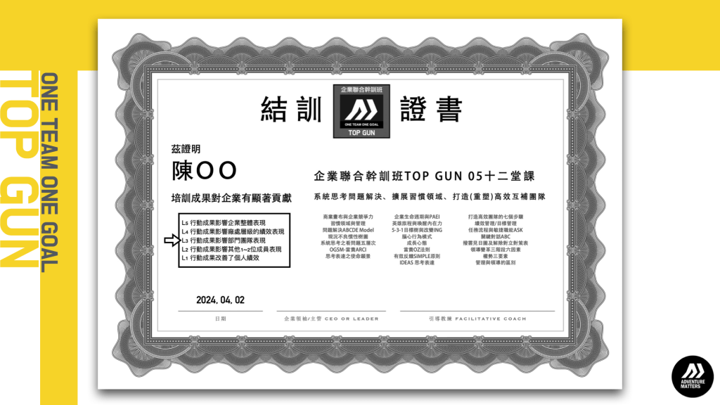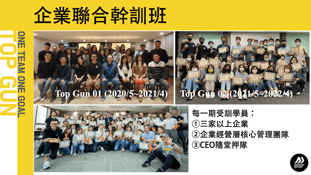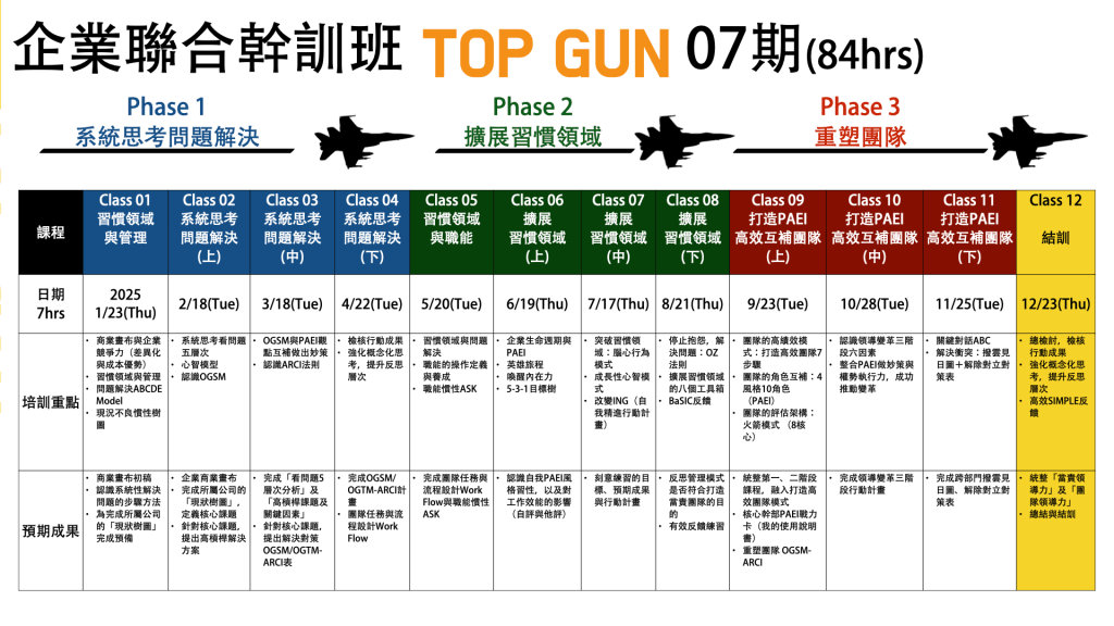 傑出的領導是讓各自獨立運作的個體,能為共同目標一同努力完成任務。TOP GUN 企業聯合幹訓班:為一年期「實戰解題培訓繼輔導方案」。