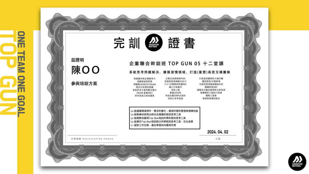 - 師資:吳兆田 博士及其所指導並認證的「影響者聯盟 (Team Development Taskforce,簡稱TDT)」教練團隊。