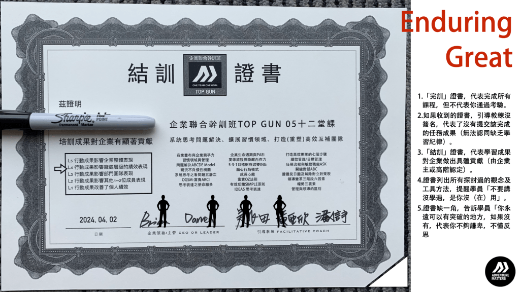 - 主辦單位(吳兆田博士,歷奇國際有限公司)依照受訓者學習紀律與成果,頒發「完訓證書」或「結訓證書」。