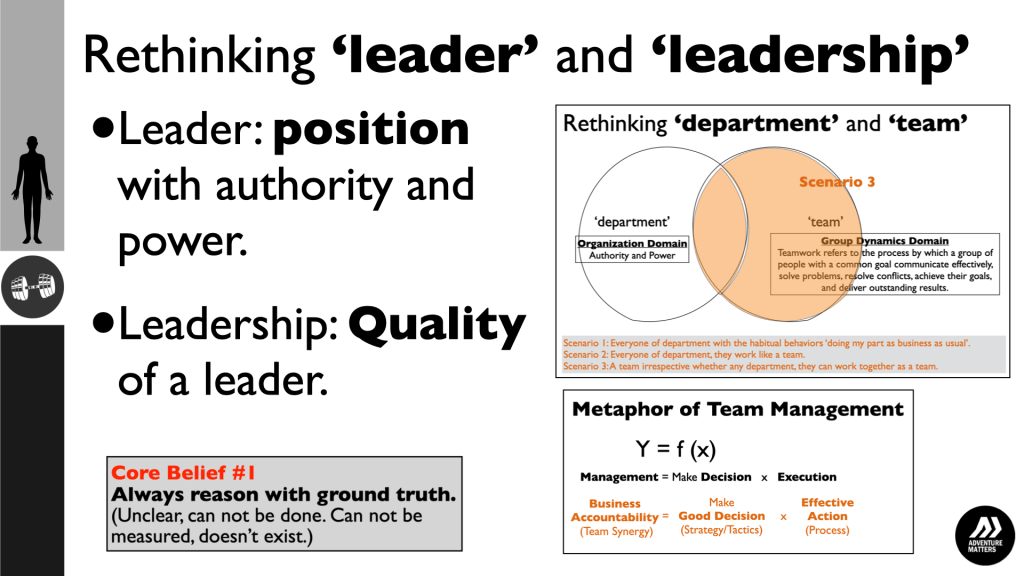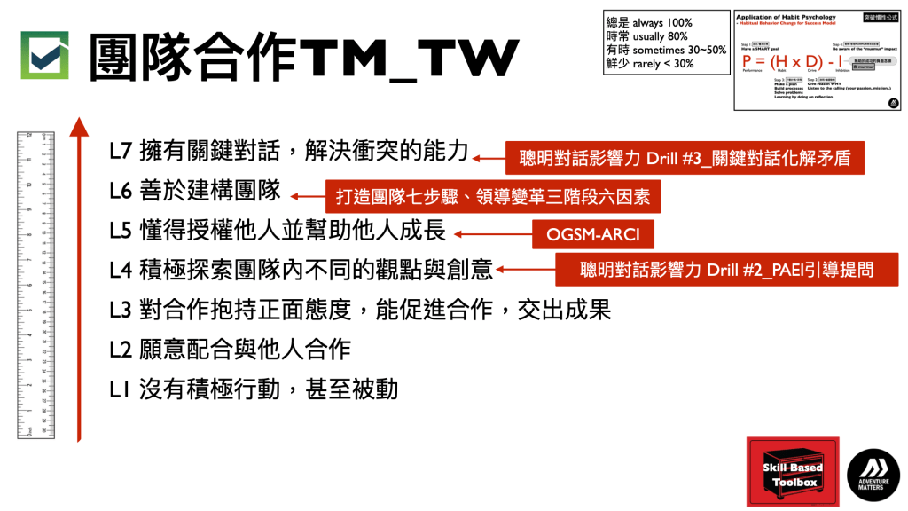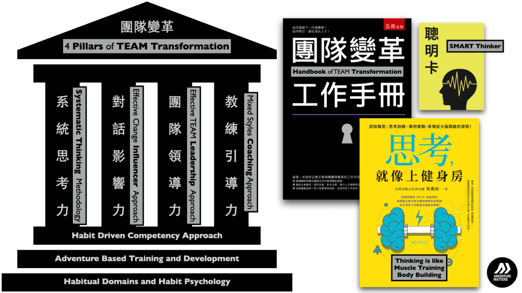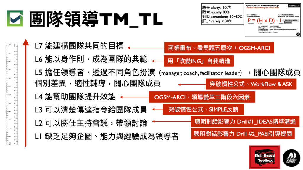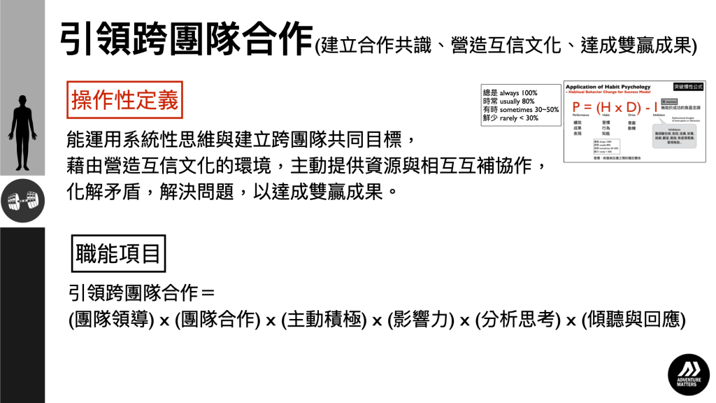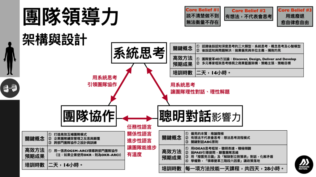 TEAM LEADERSHIP 團隊領導力。企業主管有二種,一種是有領導能力的主管;另一種是沒有領導能力的主管。個人的績效達標,只能證明個人的專業及敬業的行為態度,不代表具備傑出的領導能力。領導能力並非與生俱來,而是後天刻意培養而來。有一句俗話:「人類最有創造力的行為是協作,而非領導;但領導行為卻是促進人與人之間協作的關鍵」。